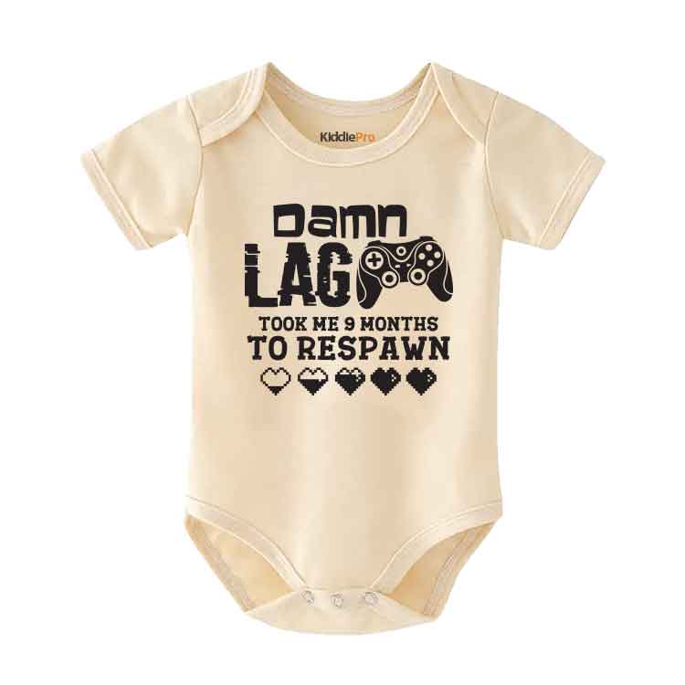 Get ready to level up your baby's wardrobe with this adorable gamer-themed bodysuit! Featuring the witty phrase "Damn Lag It took me 9 months to respawn," this bodysuit is perfect for any little one with gaming enthusiast parents. Made with soft, comfortable fabric, your baby will be ready to take on any adventure in style.