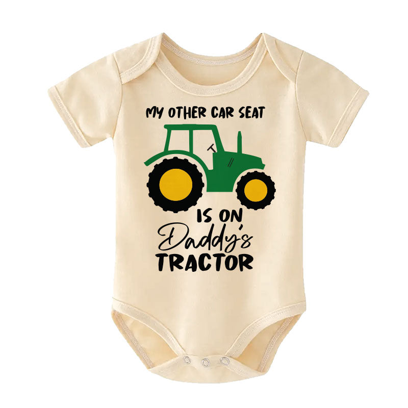 Get your little one ready for farming fun with our Farm Tractor Baby bodysuit! Featuring a playful "My other car seat is on daddy's tractor" design, this outfit is perfect for future farmers. A must-have for any proud parent who loves to play outside.