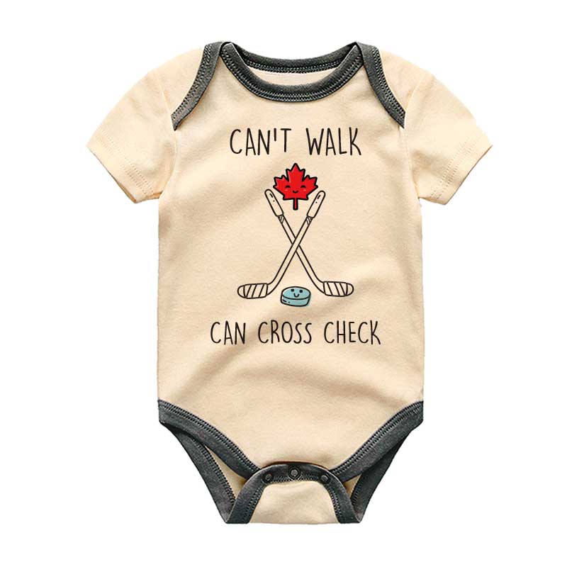 Celebrate Canada Day with this hilarious bodysuit for your little one! Featuring a playful hockey player design, this custom unisex outfit is perfect for baby showers and announcements. Show off your Canadian pride and sense of humor with this unique gift.