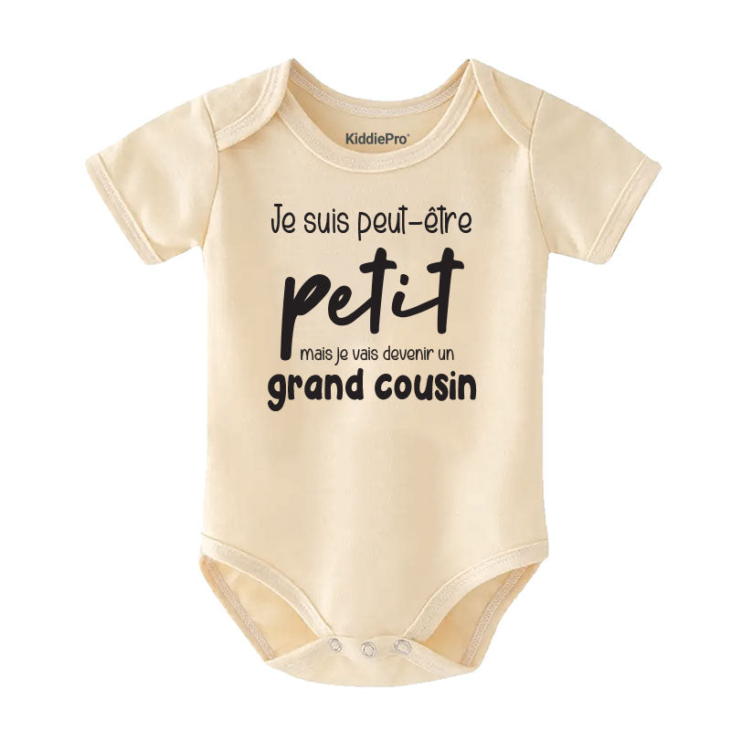 Celebrate your little one’s future role with this charming unisex baby bodysuit featuring the phrase 'Je suis peut-être petit mais je vais devenir un grand cousin' (I may be small, but I’m going to be a big cousin). Made from soft, breathable fabric, this short-sleeve romper is perfect for newborns who are about to become the coolest big cousin. A thoughtful and playful gift for family celebrations, baby showers, or any occasion!
