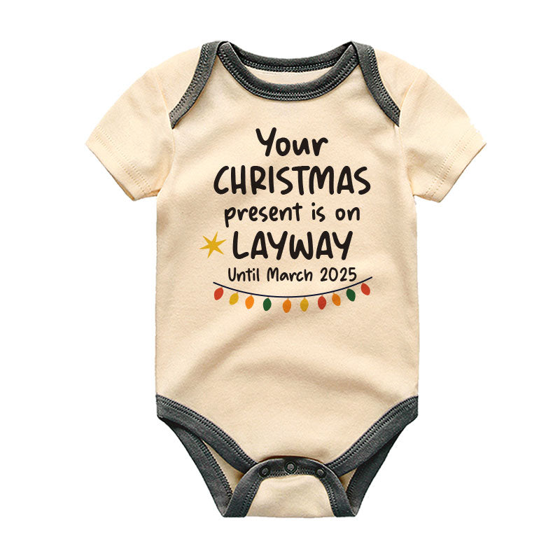 Get into the holiday spirit with our playful ‘Your Christmas Present is on Layaway Until (Custom Month Year)’ baby outfit! This adorable design adds a touch of humor to your little one’s festive wardrobe, making it perfect for family gatherings and holiday celebrations. Crafted from soft, comfy fabric, this outfit ensures your baby stays cozy while spreading smiles. Customize the month and year to make this outfit a unique keepsake for your baby's first Christmas. It's a fun way to capture the magic of the season while waiting for those special presents to arrive! This baby bodysuit is machine washable, making it easy to care for. The romper is super soft and easy to wear and take off, with a snap closure. This bodysuit is designed and created by a mom who is passionate in creating playful, cute, and trendy design. 100% handmade with love and care for your little one!