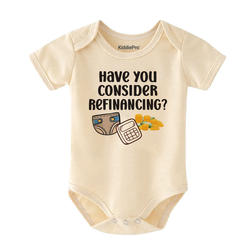 Add some Canadian humor to baby fashion with our “Have You Considered Refinancing?” baby bodysuit! A must-have for mortgage brokers, loan officers, and real estate parents across Canada. This soft cotton onesie makes a hilarious baby shower gift, newborn coming home outfit, or everyday wear. Personalize it with your baby’s name for a unique Canadian keepsake!