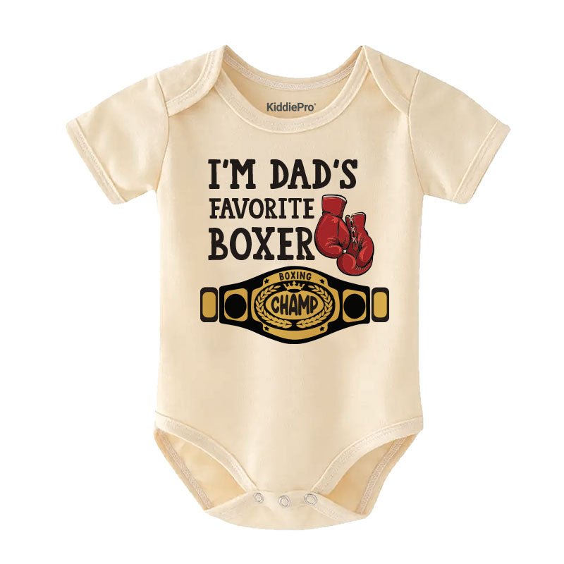 Adorable unisex baby bodysuit featuring 'I'm Dad's Favorite Boxer.' Perfect for little future boxing champions, this sporty romper is crafted from soft, breathable fabric, combining comfort with a playful nod to Dad’s favorite sport. Great for newborns and sports-loving families!