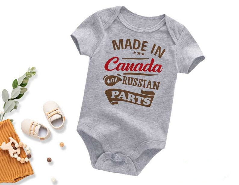 Made in Canada with Russian Parts baby bodysuit Custom Baby Shower Gift Custom Baby Nationality Bodysuit, Funny Half Baby