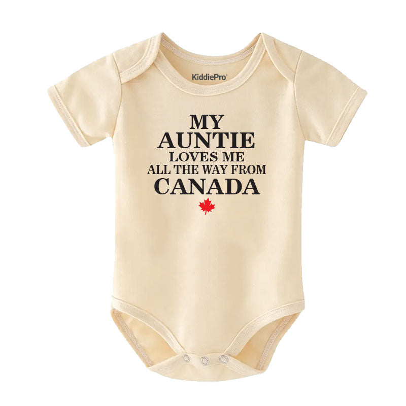 Show off the love from afar with this adorable unisex baby bodysuit featuring 'My Auntie Loves Me All the Way from Canada.' Complete with a charming maple leaf design, this short-sleeve romper is crafted from soft, high-quality fabric for your baby’s comfort. Perfect as a heartfelt gift from a proud aunt to her niece or nephew, this outfit celebrates family bonds and Canadian pride. Ideal for newborns, baby showers, or as a special keepsake to cherish forever!