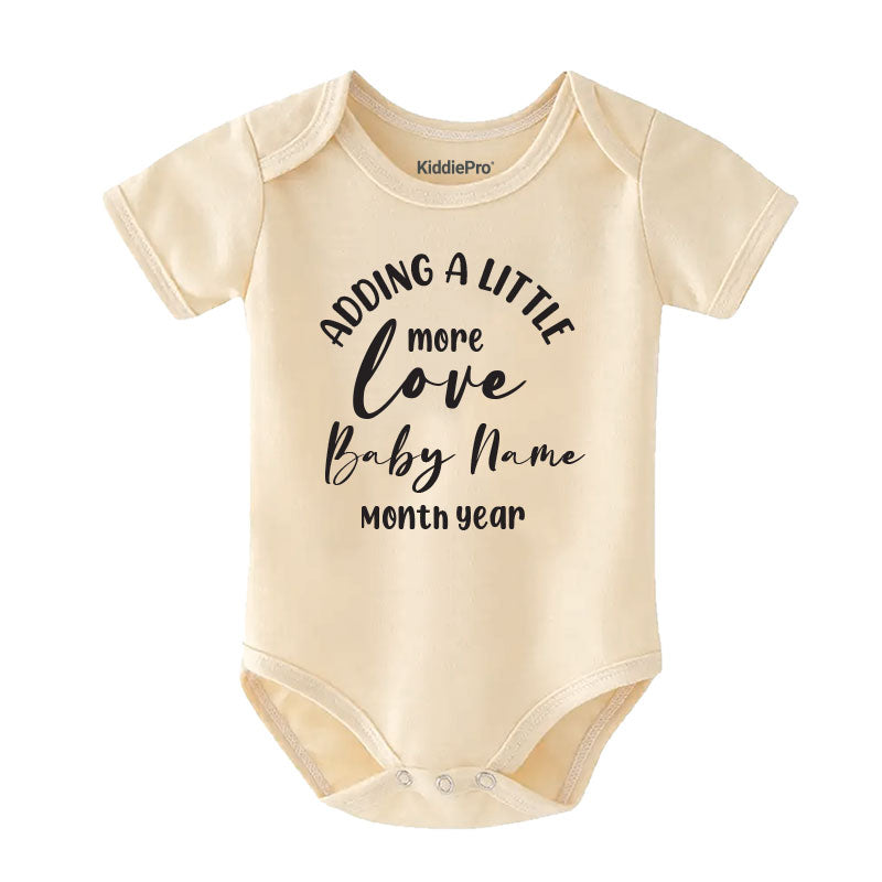 Celebrate life’s sweetest blessing with our “Adding a Little More Love” Personalized Baby Bodysuit. 🍼💖 This custom baby outfit features your baby’s name, month, and year, making it a one-of-a-kind keepsake for families to treasure forever.
