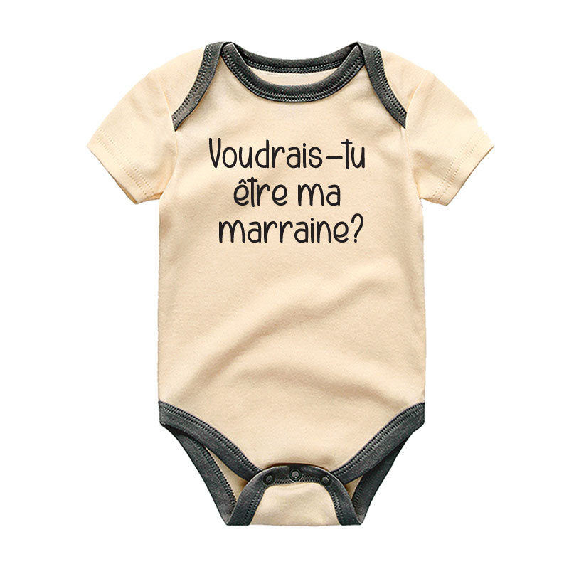 Make a heartfelt godparent proposal with this adorable "Voudrais-tu être ma marraine?" Baby Bodysuit! This French godmother unisex romper is the perfect way to ask that special person to take on this meaningful role in your baby's life. Made from soft, breathable fabric, it's ideal for newborn boys and girls, ensuring comfort and style. Whether it’s for a godmother reveal, baptism announcement, or baby shower gift, this charming bodysuit is a keepsake to cherish forever.