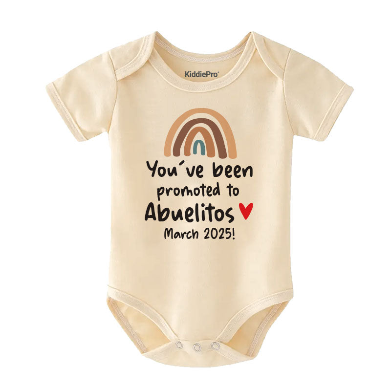 Surprise soon-to-be grandparents with this adorable "You've Been Promoted to Abuelitos" Baby Bodysuit! This gender-neutral pregnancy announcement outfit is the perfect way to share the exciting news with Spanish-speaking grandparents. Made from soft, breathable fabric, this custom newborn romper ensures comfort for baby boys and girls. Whether it’s a heartfelt baby reveal, baby shower gift, or a special keepsake, this bodysuit is a beautiful way to celebrate the arrival of a new grandchild!
